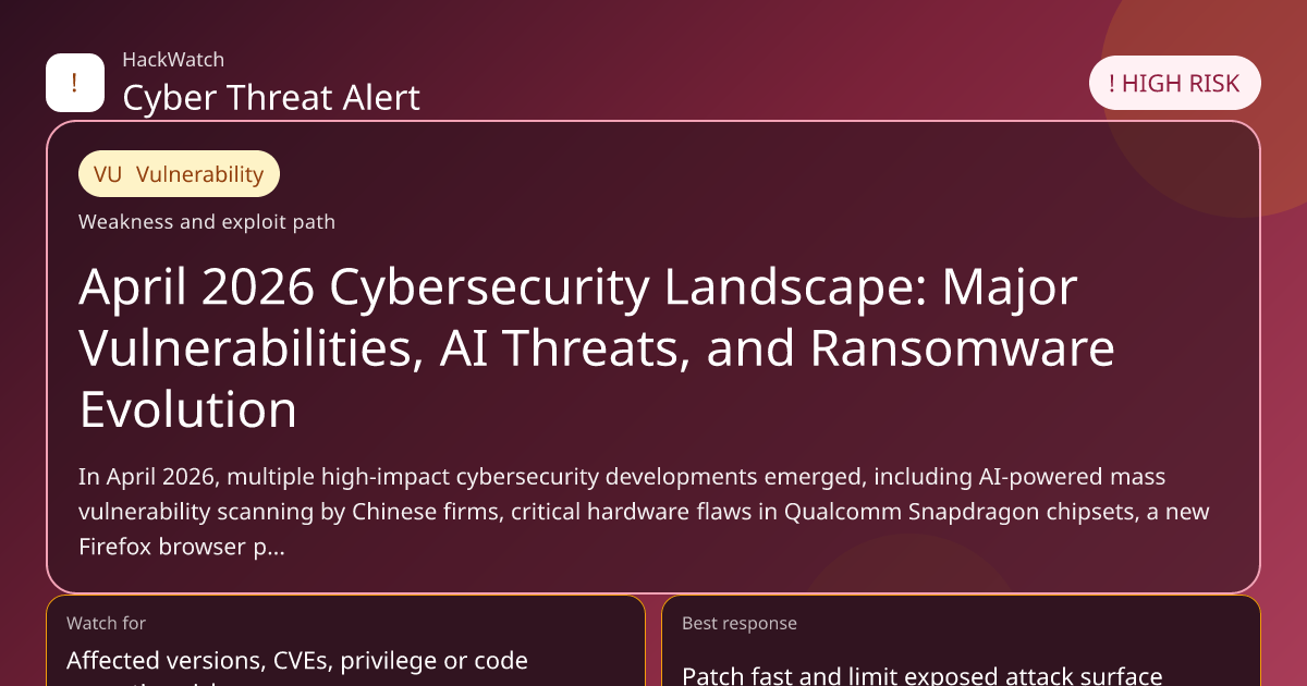 In April 2026, multiple high-impact cybersecurity developments emerged, including AI-powered mass vulnerability scanning by Chinese firms, critical hardware flaws in Qualcomm Snapdragon chipsets, a new Firefox browser privacy exploit, and the rise of the ransomware group The Gentlemen. This article consolidates verified reports from Red Hot Cyber and Bloomberg to provide a comprehensive overview of these threats, who is affected, and actionable steps to protect yourself and your organization.