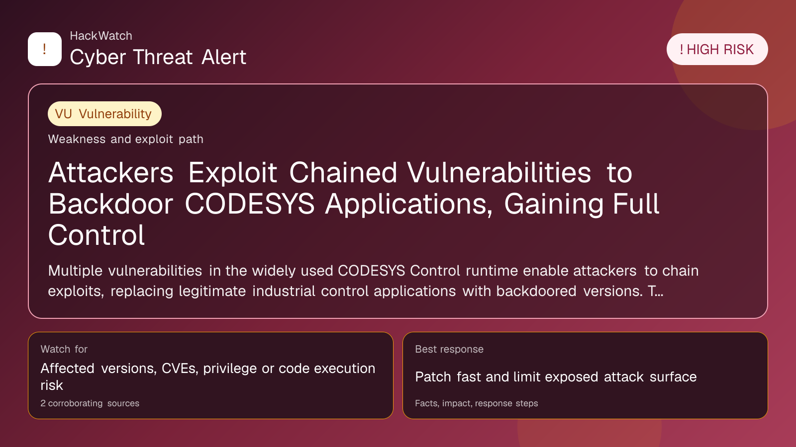 Security researchers at Nozomi Networks Labs have uncovered a critical chain of three vulnerabilities in the CODESYS Control runtime environment. These flaws, when exploited in sequence by an authenticated attacker with low-level privileges, enable the replacement of legitimate industrial control applications with backdoored versions. This attack vector grants full administrative control over the affected devices, posing a significant risk to industrial control systems worldwide. This article consolidates multiple corroborating reports to provide a comprehensive analysis of the vulnerabilities, affected parties, practical mitigation steps, and the evolving threat landscape as of 2026.