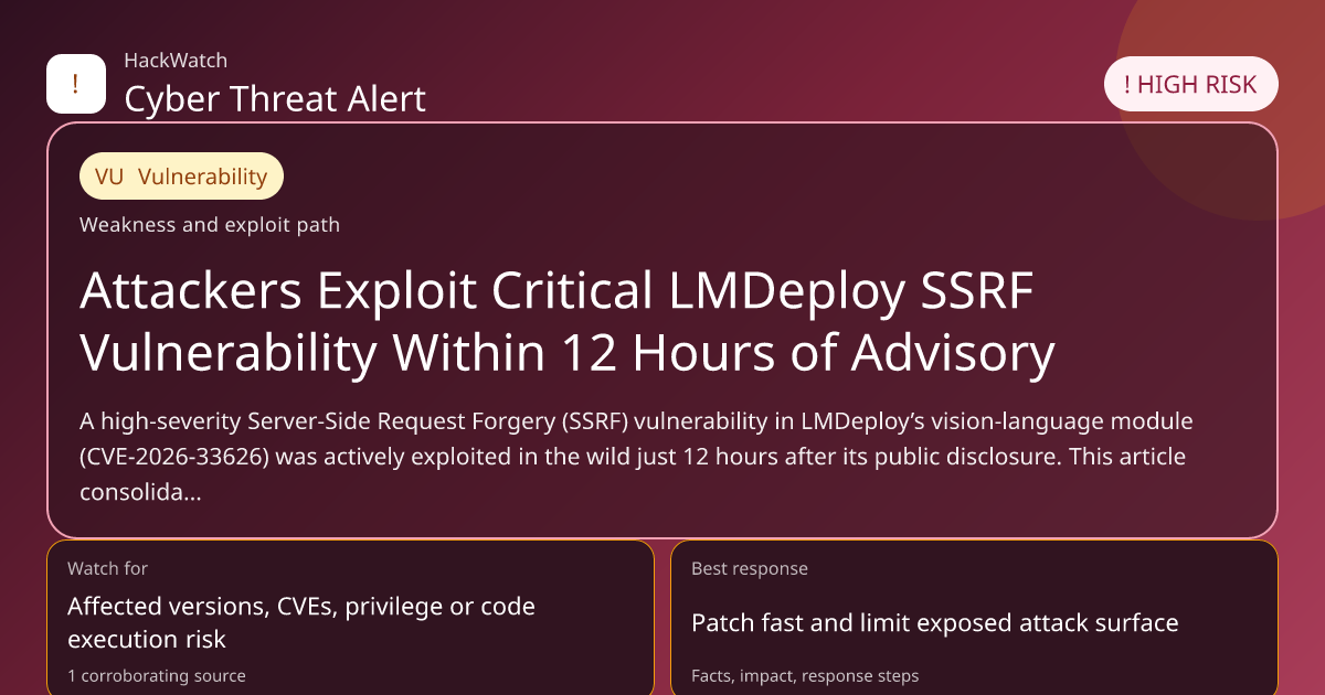 A high-severity Server-Side Request Forgery (SSRF) vulnerability in LMDeploy’s vision-language module (CVE-2026-33626) was actively exploited in the wild just 12 hours after its public disclosure. This article consolidates multiple source reports to provide a comprehensive analysis of the attack timeline, affected parties, and actionable steps to mitigate risk. We also cover the latest 2026 updates and practical guidance for securing systems against this rapidly weaponized flaw.