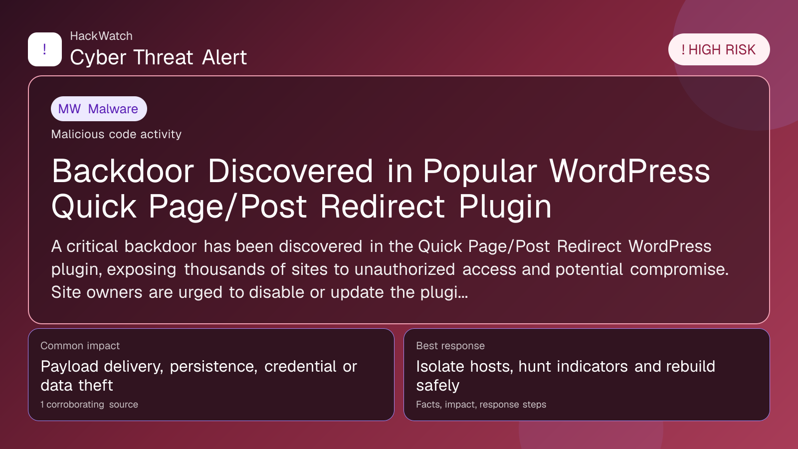A critical backdoor has been discovered in the Quick Page/Post Redirect WordPress plugin, exposing thousands of sites to unauthorized access and potential compromise. Site owners are urged to disable or update the plugin immediately to prevent exploitation.