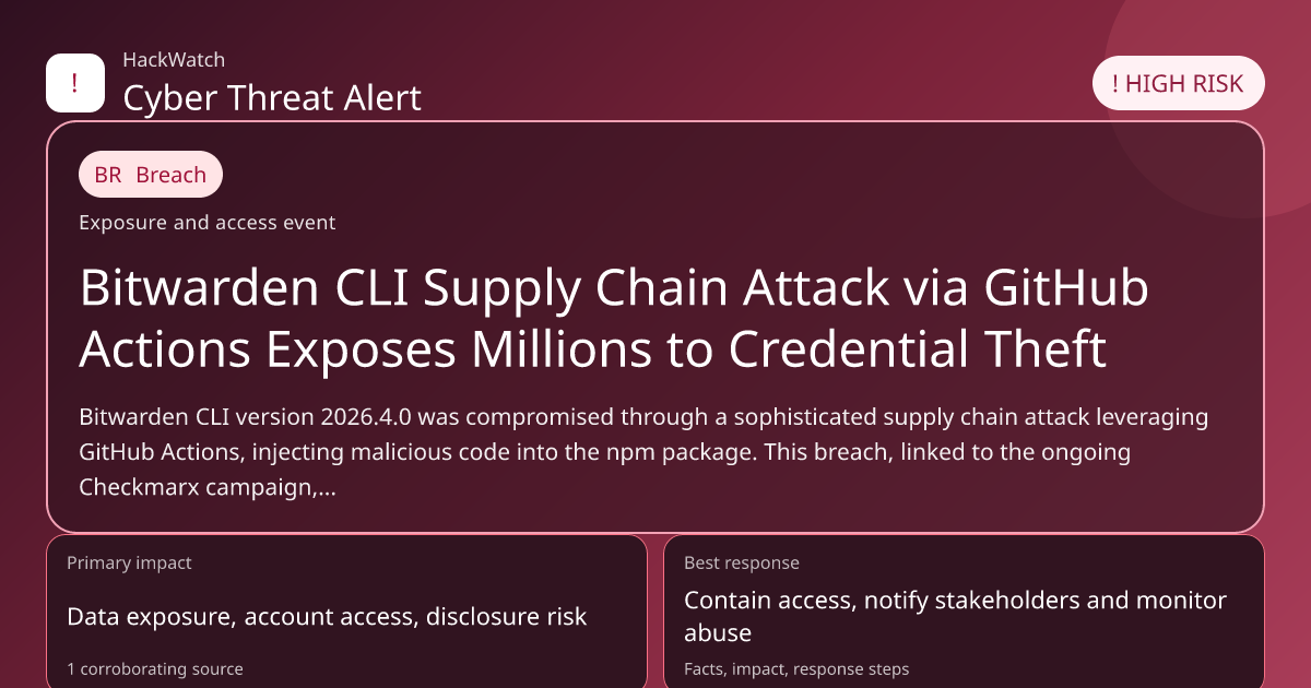 Bitwarden CLI version 2026.4.0 was compromised through a sophisticated supply chain attack leveraging GitHub Actions, injecting malicious code into the npm package. This breach, linked to the ongoing Checkmarx campaign, risks credential theft and CI/CD pipeline infiltration for millions of users and thousands of enterprises. This article consolidates multiple verified sources to detail the incident, affected parties, and actionable steps to secure accounts and systems in 2026 and beyond.