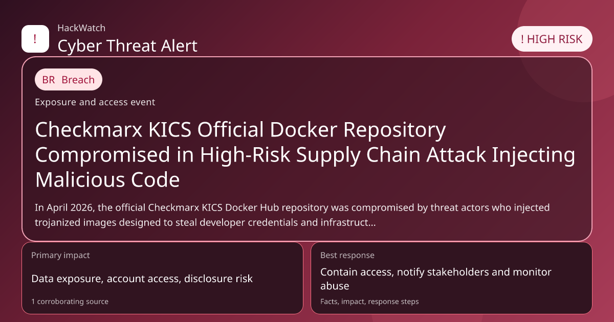 In April 2026, the official Checkmarx KICS Docker Hub repository was compromised by threat actors who injected trojanized images designed to steal developer credentials and infrastructure secrets. This supply chain attack was swiftly detected by Docker's internal monitoring and reported by cybersecurity researchers. This article consolidates multiple sources to provide a detailed analysis of the incident, its impact, and actionable steps for affected users and organizations to secure their environments.