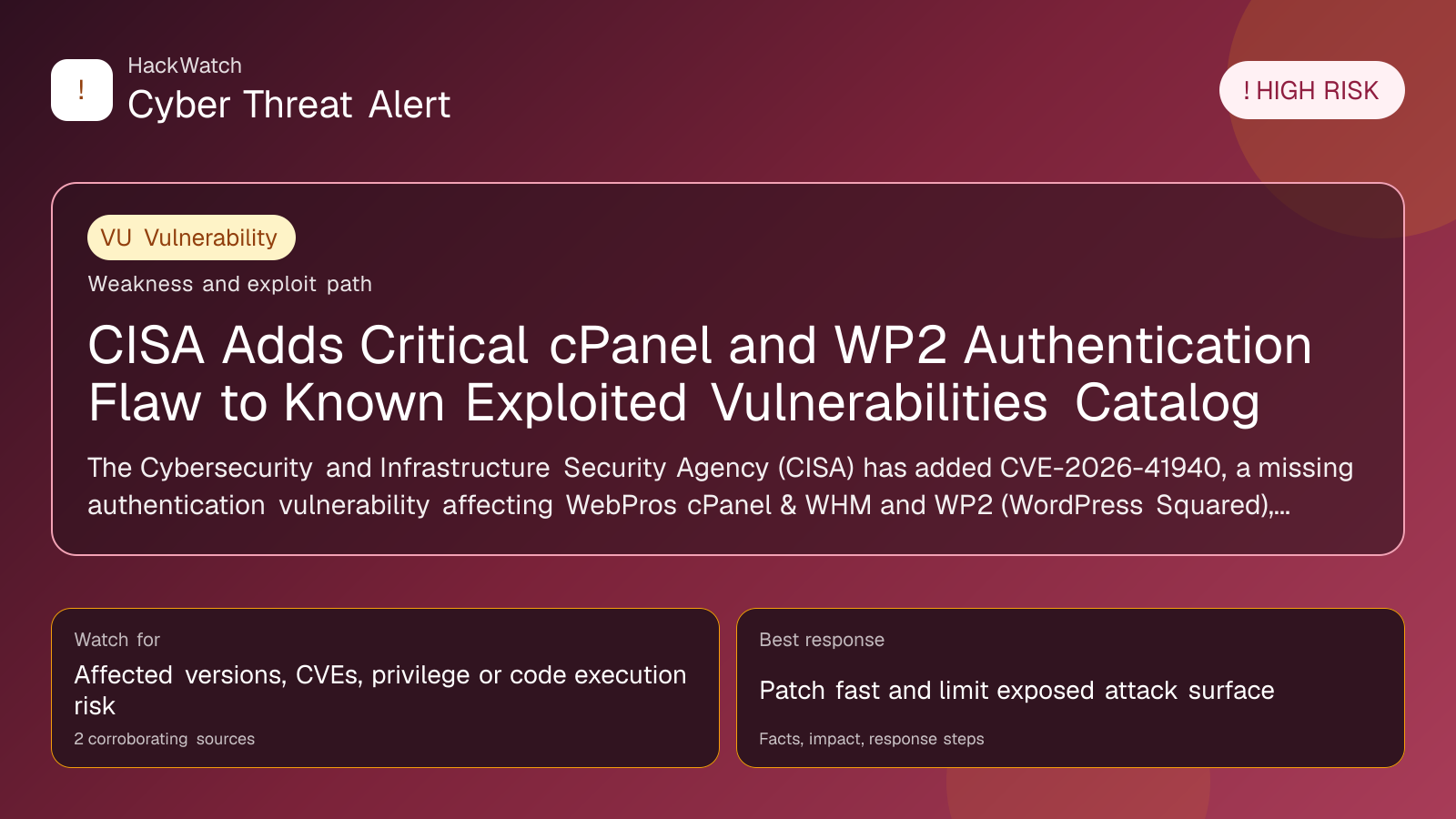 The Cybersecurity and Infrastructure Security Agency (CISA) has added CVE-2026-41940, a missing authentication vulnerability affecting WebPros cPanel & WHM and WP2 (WordPress Squared), to its Known Exploited Vulnerabilities Catalog following evidence of active exploitation. Federal agencies must address this flaw under Binding Operational Directive 22-01, while all organizations are urged to prioritize remediation to mitigate significant cyber risks.