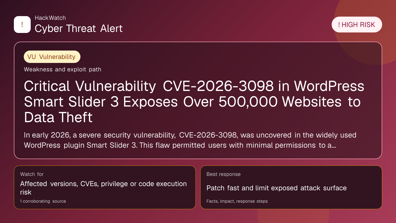 Smart Slider 3 is among the most widely used WordPress plugins, powering dynamic visual content on hundreds of thousands of sites globally. The discovery of CVE-2026-3098 exposed a massive attack surface, putting sensitive data and website integrity at significant risk.