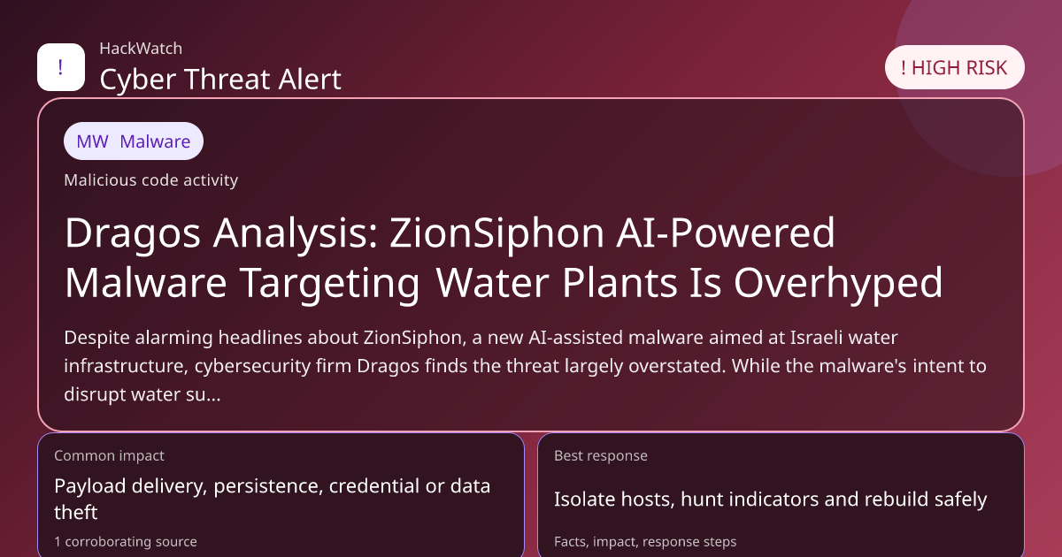 Initial media coverage painted ZionSiphon as a highly sophisticated and imminent threat to national water security, raising alarms about potential widespread disruptions. However, a detailed analysis by Dragos, a leading OT cybersecurity firm, challenges this narrative, describing the malware as largely ineffective and the product of amateur developers experimenting with AI rather than a state-sponsored advanced persistent threat (APT).
