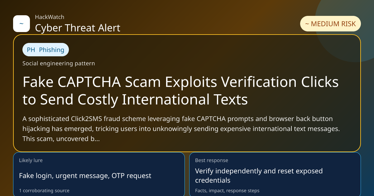 A sophisticated Click2SMS fraud scheme leveraging fake CAPTCHA prompts and browser back button hijacking has emerged, tricking users into unknowingly sending expensive international text messages. This scam, uncovered by Infoblox research and reported by HackRead, poses a medium-level risk affecting global internet users. This article consolidates all known facts, outlines who is impacted, and provides actionable guidance on detection, prevention, and recovery in 2026.