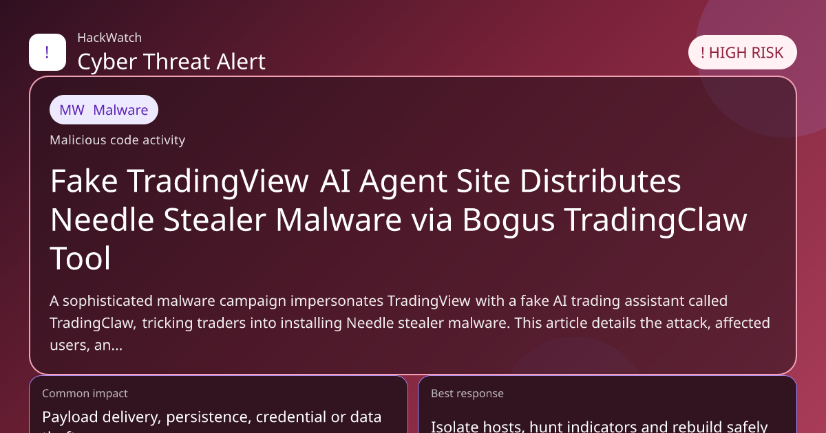 A sophisticated malware campaign impersonates TradingView with a fake AI trading assistant called TradingClaw, tricking traders into installing Needle stealer malware. This article details the attack, affected users, and actionable steps to secure accounts and devices in 2026.