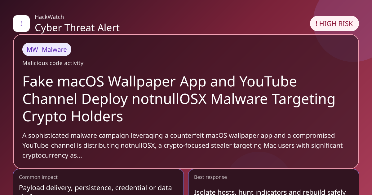 A sophisticated malware campaign leveraging a counterfeit macOS wallpaper app and a compromised YouTube channel is distributing notnullOSX, a crypto-focused stealer targeting Mac users with significant cryptocurrency assets. This article consolidates multiple reports to provide a comprehensive analysis of the threat, its modus operandi, affected users, and actionable steps to mitigate risk in 2026.