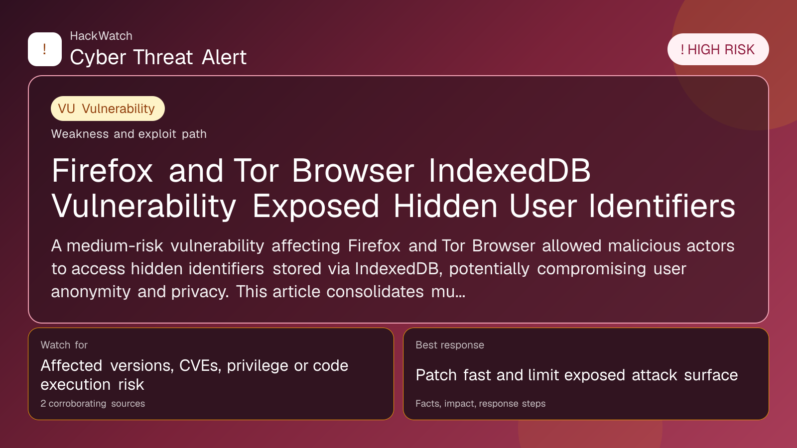 A medium-risk vulnerability affecting Firefox and Tor Browser allowed malicious actors to access hidden identifiers stored via IndexedDB, potentially compromising user anonymity and privacy. This article consolidates multiple reports to provide a comprehensive analysis, detailing the nature of the flaw, affected users, and concrete mitigation steps for 2024 and beyond.