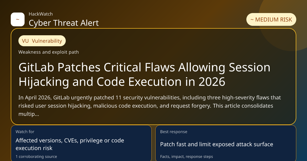 On April 22, 2026, GitLab released emergency security updates addressing 11 vulnerabilities across its Community Edition (CE) and Enterprise Edition (EE). These patches, rolled out in versions 18.11.1, 18.10.4, and 18.9.6, remedied critical weaknesses that could allow attackers to hijack user sessions, execute arbitrary malicious code, and perform cross-site request forgery (CSRF) attacks.
