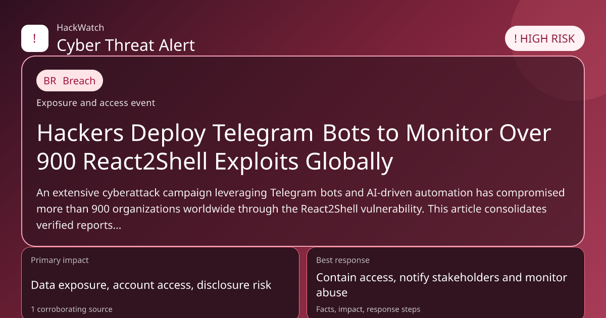In a large-scale cyber espionage and exploitation campaign uncovered in April 2026, threat actors have been using a sophisticated toolkit combining AI-assisted scanning, automated exploitation, and Telegram bots to silently breach over 900 companies globally. The operation centers on exploiting the React2Shell vulnerability—a critical flaw in internet-facing web applications that allows remote code execution.