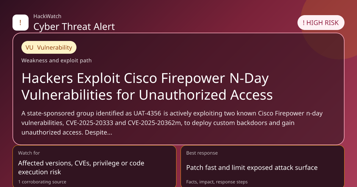 A state-sponsored group identified as UAT-4356 is actively exploiting two known Cisco Firepower n-day vulnerabilities, CVE-2025-20333 and CVE-2025-20362m, to deploy custom backdoors and gain unauthorized access. Despite patches being available, unmitigated systems remain at high risk, underscoring the critical need for immediate remediation and enhanced security measures.