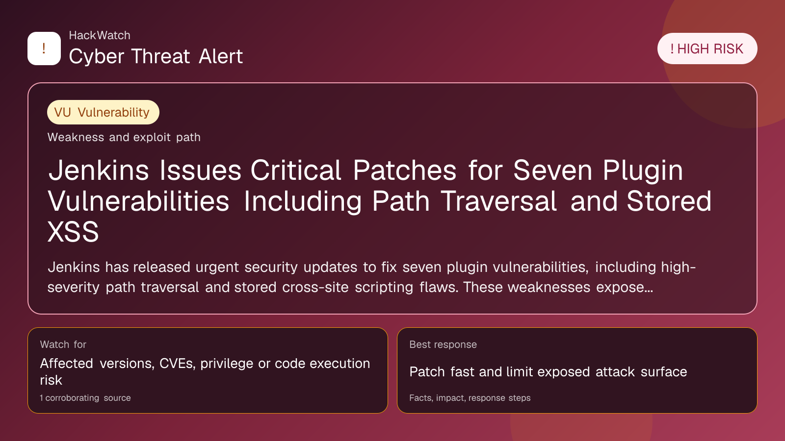 Jenkins has released urgent security updates to fix seven plugin vulnerabilities, including high-severity path traversal and stored cross-site scripting flaws. These weaknesses expose CI/CD environments to risks such as remote code execution and session hijacking. Administrators are advised to update plugins immediately to prevent potential exploitation.