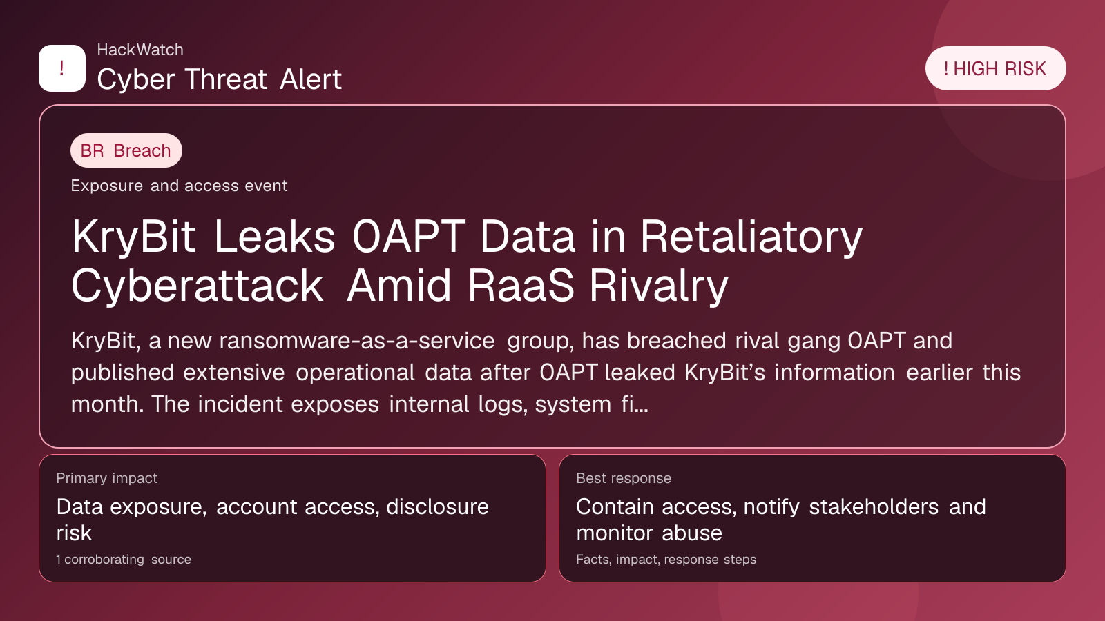 KryBit, a new ransomware-as-a-service group, has breached rival gang 0APT and published extensive operational data after 0APT leaked KryBit’s information earlier this month. The incident exposes internal logs, system files, and source code, highlighting escalating conflicts within cybercrime communities.