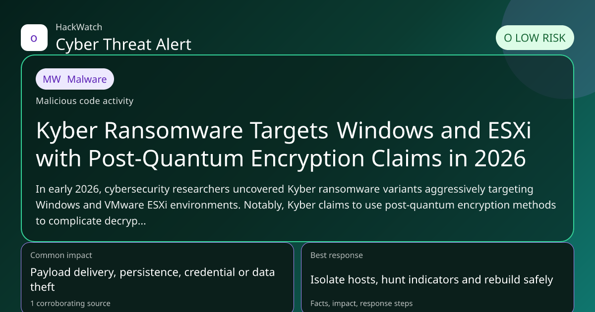 In March 2026, cybersecurity firm Rapid7 analyzed two distinct variants of the Kyber ransomware that were deployed simultaneously on the same network. These ransomware strains specifically targeted Windows operating systems and VMware ESXi hypervisors, indicating a strategic focus on both endpoint and virtualization infrastructure. Kyber ransomware has attracted attention due to its claims of employing post-quantum cryptographic algorithms, a novel approach intended to resist decryption even by future quantum computing capabilities.