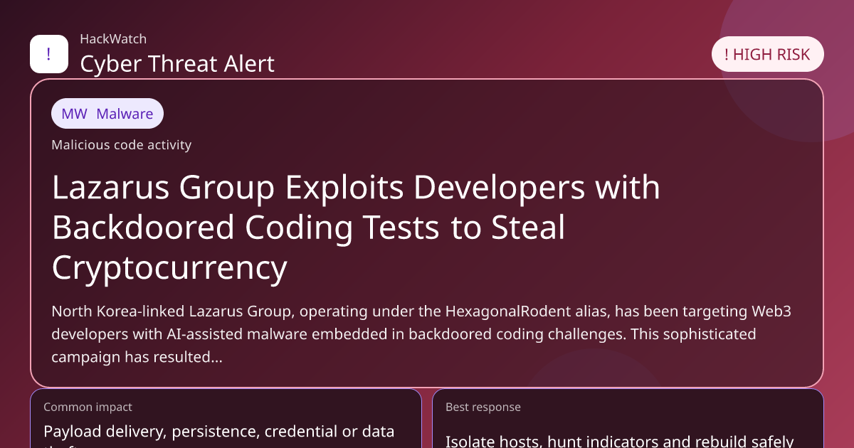 Tags: Lazarus Group, HexagonalRodent, North Korea cyber threat, Web3 security, cryptocurrency theft, backdoored coding tests, AI-assisted malware, blockchain developer security, 2026 cybersecurity threats