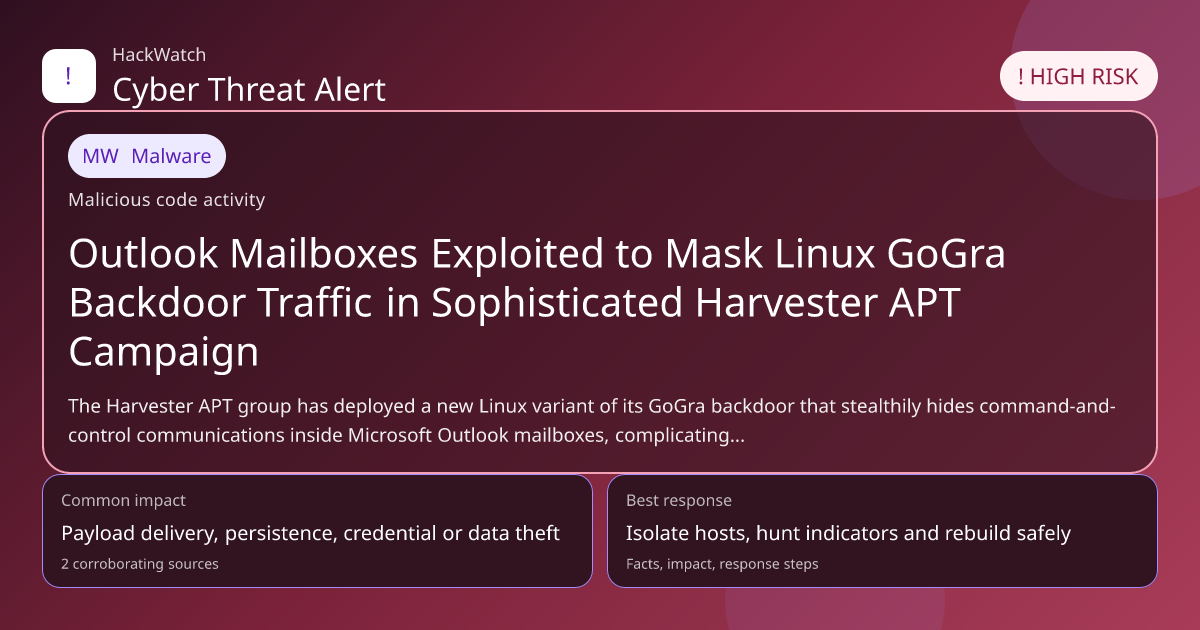 As of April 2026, the Harvester APT group has refined the GoGra Linux backdoor to further evade detection by integrating with Microsoft Outlook mailboxes. This marks a significant evolution in malware command-and-control techniques, highlighting a trend toward abusing trusted cloud and email services for stealthy communications. Security vendors are enhancing detection capabilities by incorporating mailbox behavior analytics and cross-correlating endpoint and email server logs.