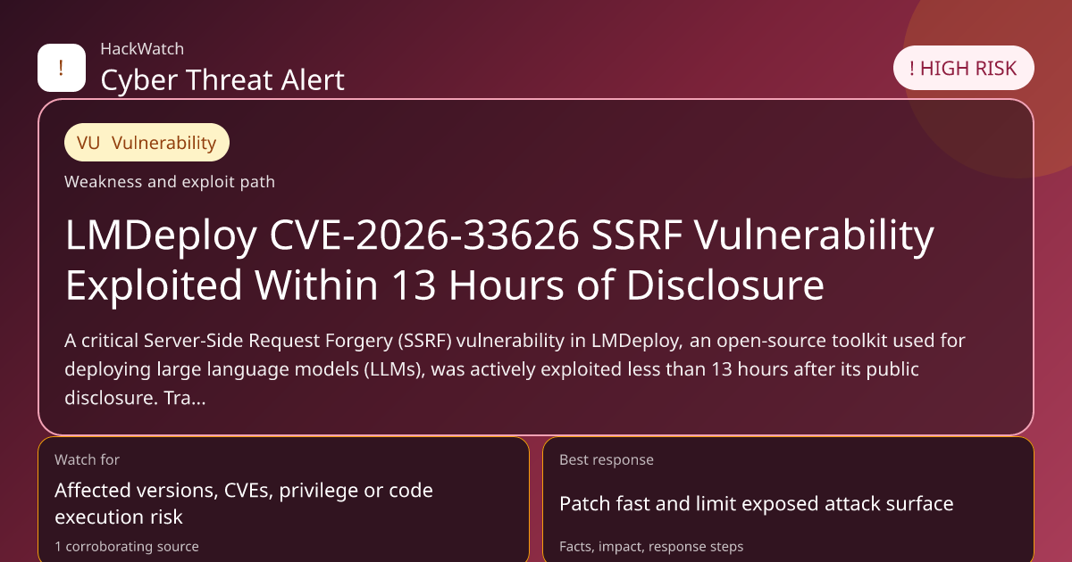 A critical Server-Side Request Forgery (SSRF) vulnerability in LMDeploy, an open-source toolkit used for deploying large language models (LLMs), was actively exploited less than 13 hours after its public disclosure. Tracked as CVE-2026-33626 with a CVSS score of 7.5, this flaw allows attackers to access sensitive internal resources, posing significant risks to organizations relying on LMDeploy. This article consolidates multiple reports to provide a comprehensive analysis of the incident, its impact, and actionable guidance on mitigation and securing affected systems.