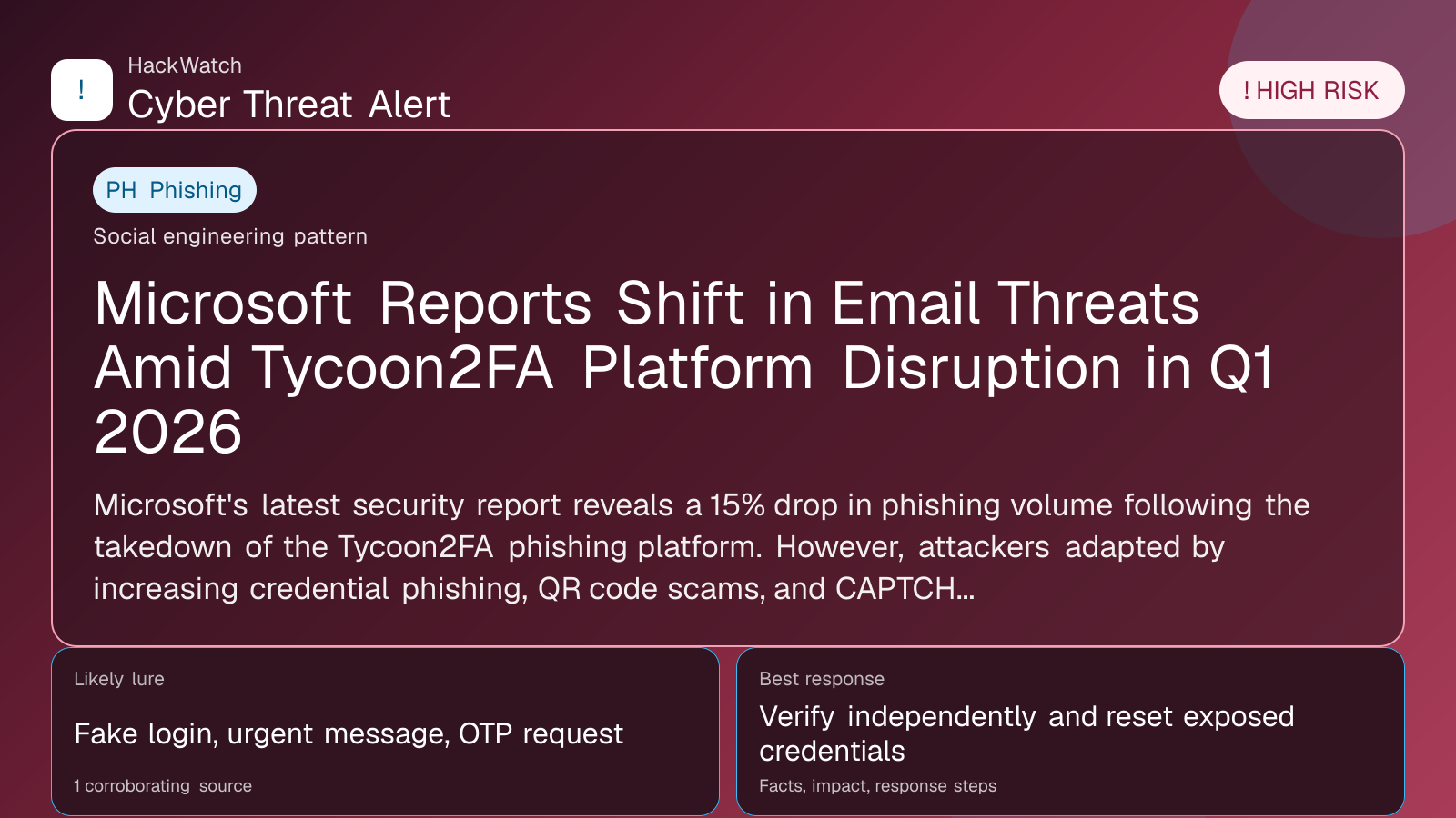 - Microsoft disrupted the Tycoon2FA phishing platform, reducing phishing volume by 15% in Q1 2026.