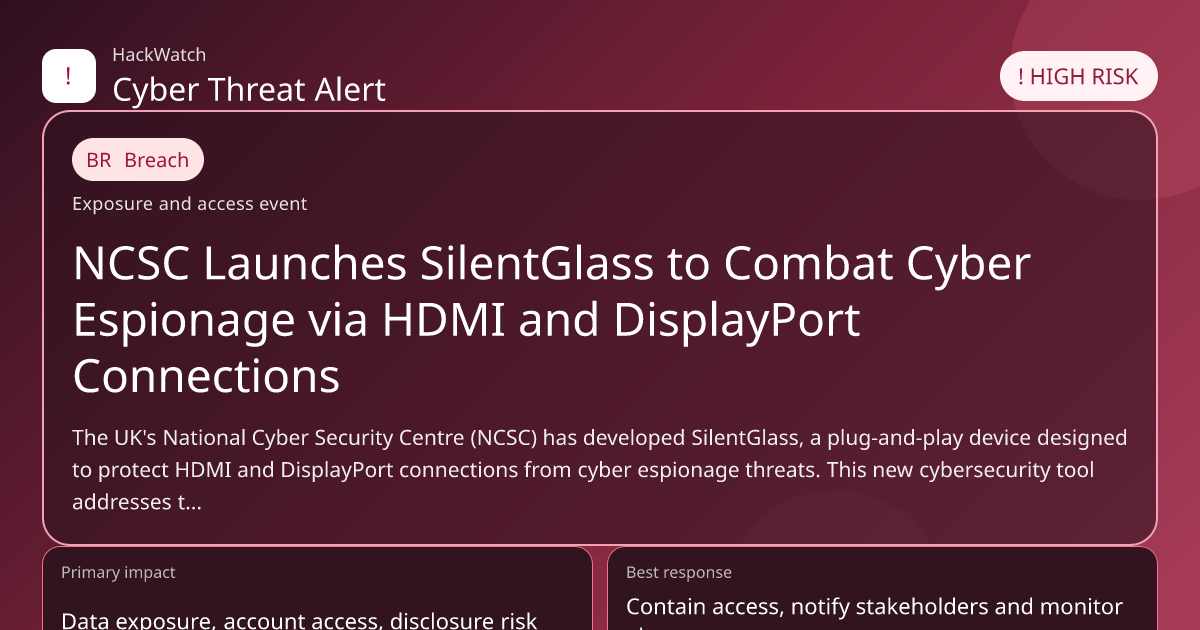 The UK's National Cyber Security Centre (NCSC) has developed SilentGlass, a plug-and-play device designed to protect HDMI and DisplayPort connections from cyber espionage threats. This new cybersecurity tool addresses the overlooked risk of data interception and malware injection through display interfaces, safeguarding sensitive government and business information. This article provides a comprehensive analysis of the threat, the device's capabilities, affected parties, and actionable steps for users to enhance their security posture in 2026 and beyond.