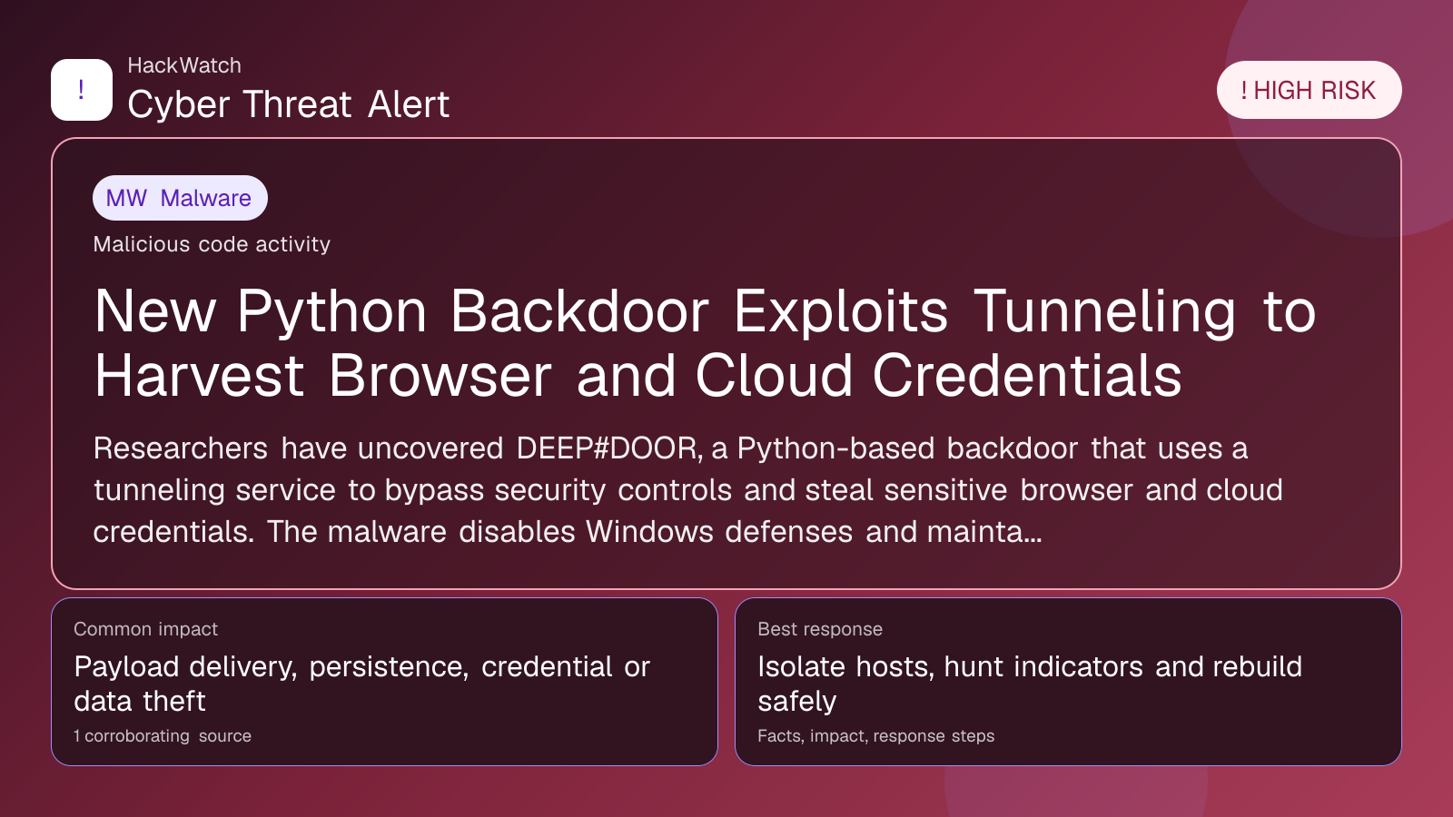 Researchers have uncovered DEEP#DOOR, a Python-based backdoor that uses a tunneling service to bypass security controls and steal sensitive browser and cloud credentials. The malware disables Windows defenses and maintains persistent access, posing a high risk to compromised systems.