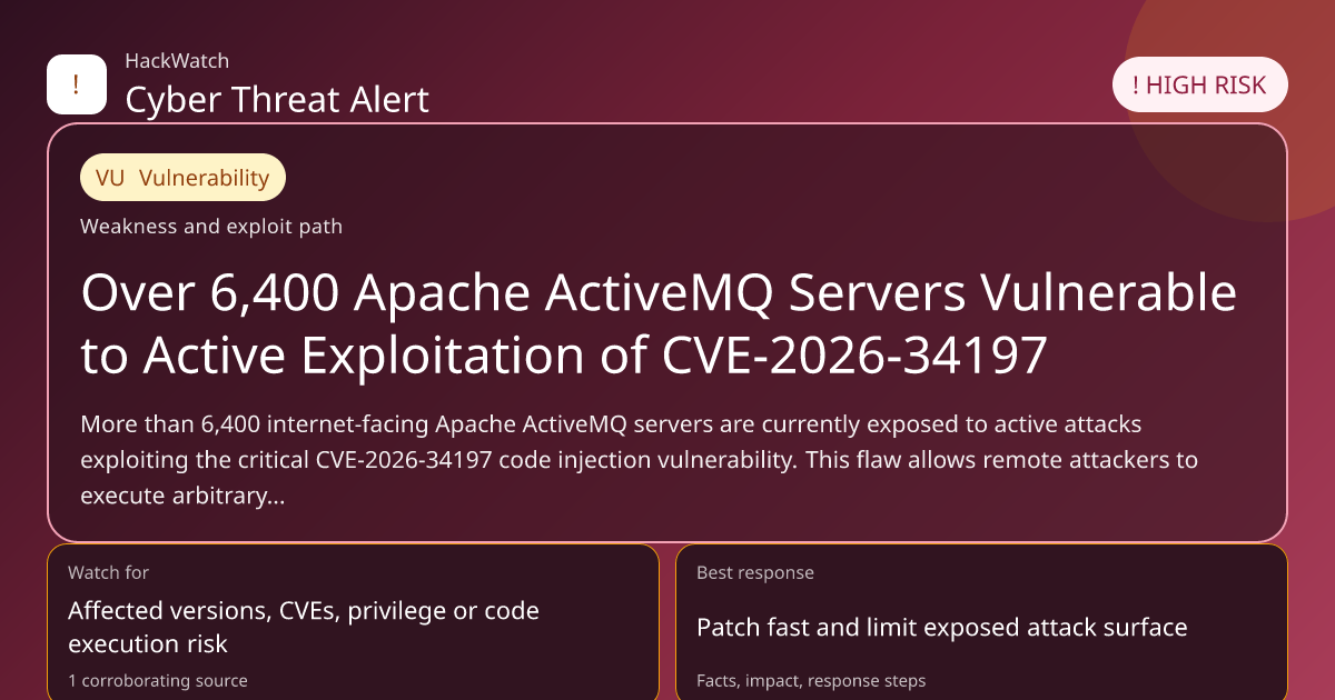 More than 6,400 internet-facing Apache ActiveMQ servers are currently exposed to active attacks exploiting the critical CVE-2026-34197 code injection vulnerability. This flaw allows remote attackers to execute arbitrary code, risking full system compromise. This article consolidates multiple reports to provide a comprehensive analysis of the threat, affected parties, and actionable mitigation steps.