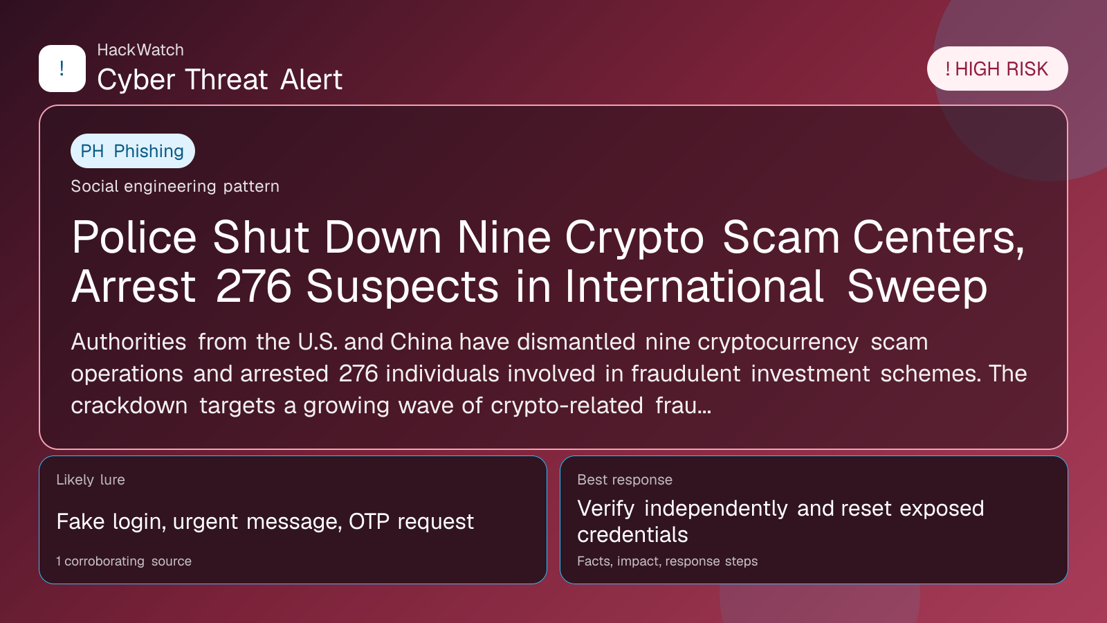 Authorities from the U.S. and China have dismantled nine cryptocurrency scam operations and arrested 276 individuals involved in fraudulent investment schemes. The crackdown targets a growing wave of crypto-related fraud affecting global investors.