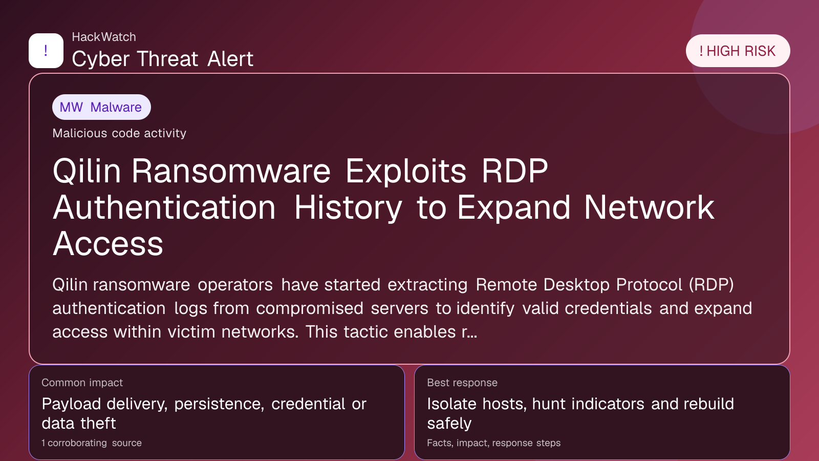 Qilin ransomware operators have started extracting Remote Desktop Protocol (RDP) authentication logs from compromised servers to identify valid credentials and expand access within victim networks. This tactic enables rapid lateral movement, increasing the scale and stealth of attacks. Security experts advise organizations to strengthen RDP controls and monitor authentication events closely to reduce exposure.