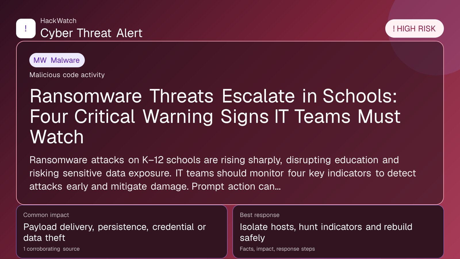 Ransomware attacks on K–12 schools are rising sharply, disrupting education and risking sensitive data exposure. IT teams should monitor four key indicators to detect attacks early and mitigate damage. Prompt action can prevent prolonged outages and costly recoveries.