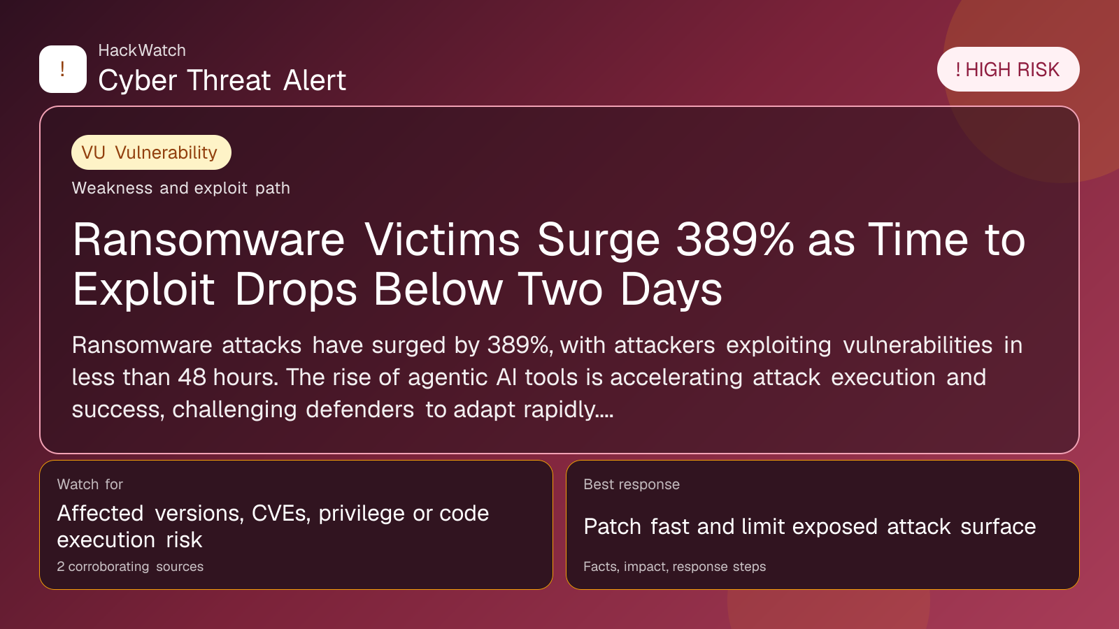 Risk remains high as attackers continue refining AI tools and tactics. Emerging vulnerabilities or delays in response could lead to even faster exploitation times and higher victim counts.