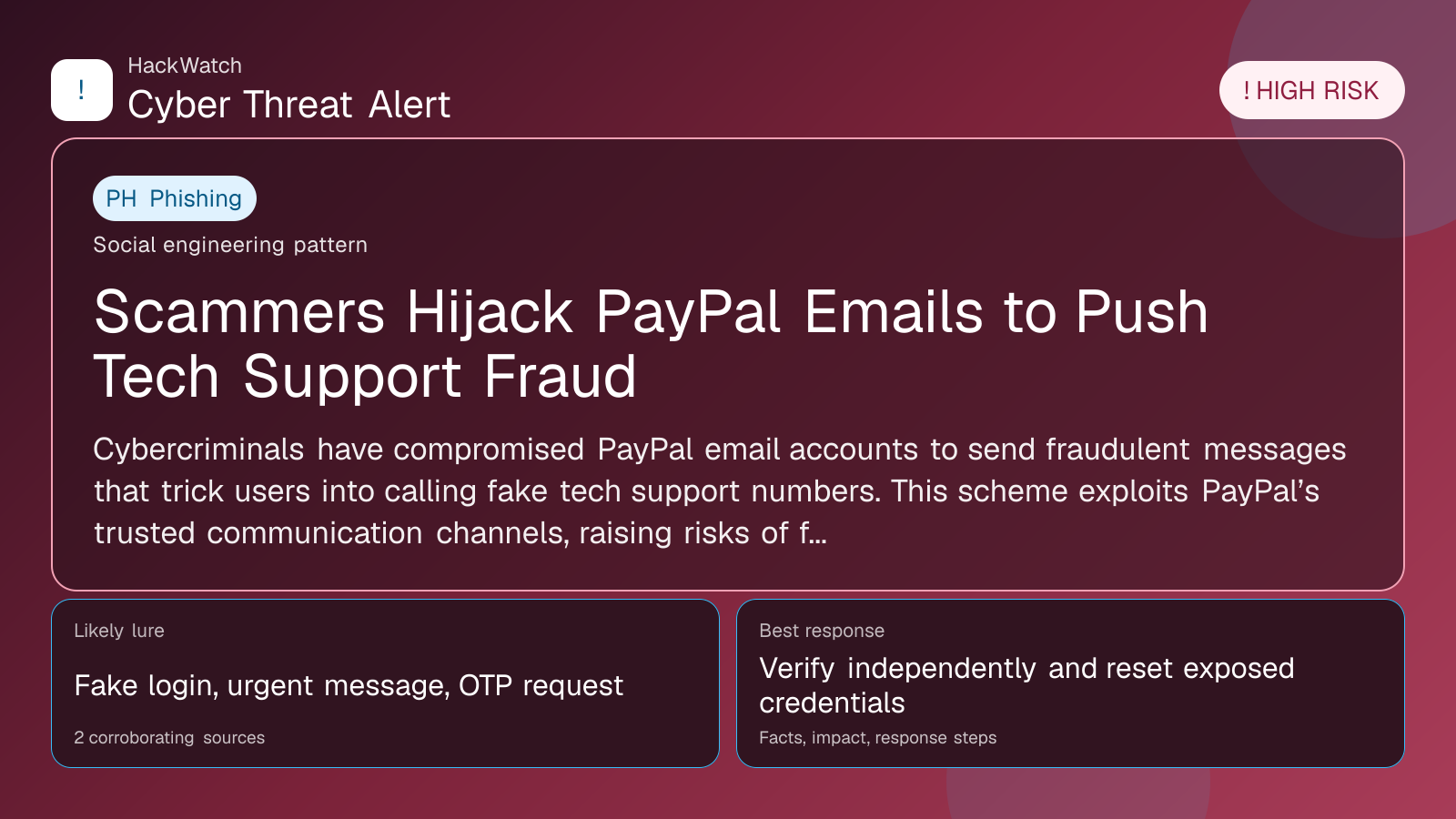 Cybercriminals have compromised PayPal email accounts to send fraudulent messages that trick users into calling fake tech support numbers. This scheme exploits PayPal’s trusted communication channels, raising risks of financial theft and identity fraud.