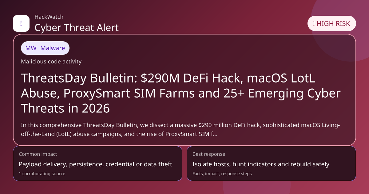 In this comprehensive ThreatsDay Bulletin, we dissect a massive $290 million DeFi hack, sophisticated macOS Living-off-the-Land (LotL) abuse campaigns, and the rise of ProxySmart SIM farms fueling cybercrime. Based on multiple corroborated sources including The Hacker News, we analyze confirmed facts, impacted parties, and provide actionable guidance to secure yourself amid evolving 2026 cyber threats.