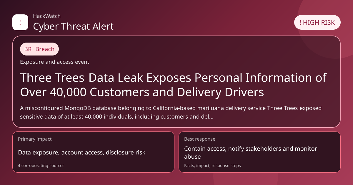 A misconfigured MongoDB database belonging to California-based marijuana delivery service Three Trees exposed sensitive data of at least 40,000 individuals, including customers and delivery drivers. This article consolidates multiple reports to provide a comprehensive analysis of the breach, its impact, and actionable steps users can take to protect themselves.