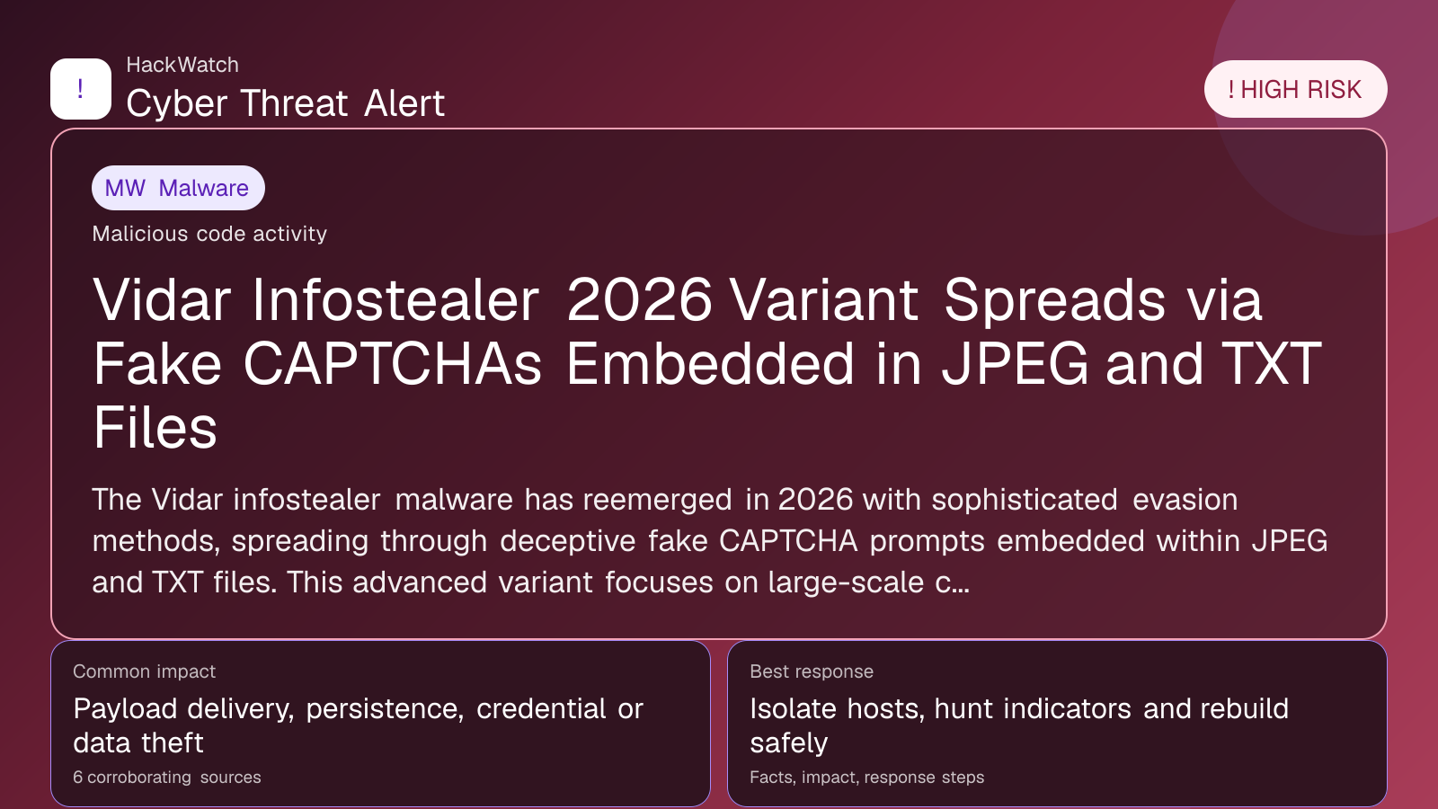 The Vidar infostealer malware has reemerged in 2026 with sophisticated evasion methods, spreading through deceptive fake CAPTCHA prompts embedded within JPEG and TXT files. This advanced variant focuses on large-scale credential theft by employing innovative file-hiding techniques that bypass traditional detection systems. Drawing from multiple verified cybersecurity reports, this article offers an in-depth examination of the attack methods, impacted users, recommended mitigation steps, and the evolving threat landscape.