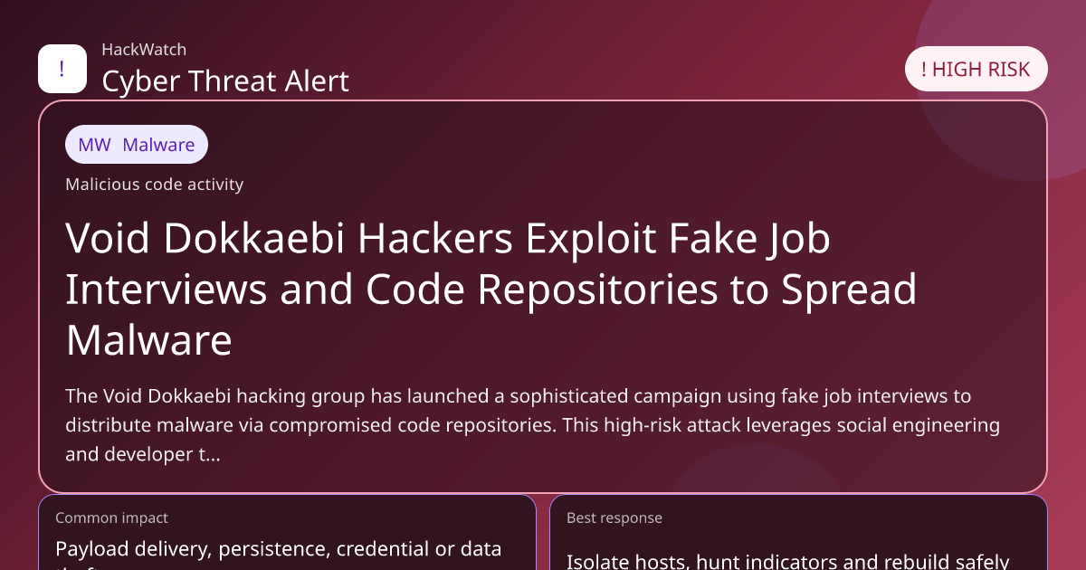 The Void Dokkaebi hacking group has launched a sophisticated campaign using fake job interviews to distribute malware via compromised code repositories. This high-risk attack leverages social engineering and developer trust to infiltrate organizations, posing significant threats to cybersecurity worldwide. This article consolidates multiple verified reports to provide a comprehensive analysis of the attack, its impact, and actionable steps for protection in 2026.